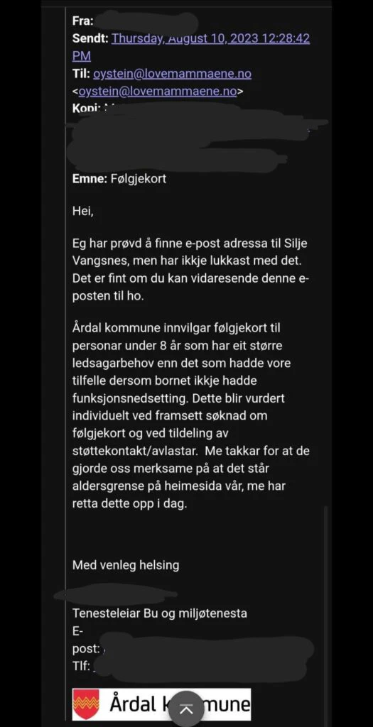 Påfølgende dag, altså i dag, fikk Silje og regionslaget vårt Løvemammaene Vest melding fra Årdal kommune om at de ikke praktiserer nedre aldersgrense, og nå har fjernet aldersgrensen for ledsagerbevis på nettsiden sin. Dette er kjempegode nyheter!