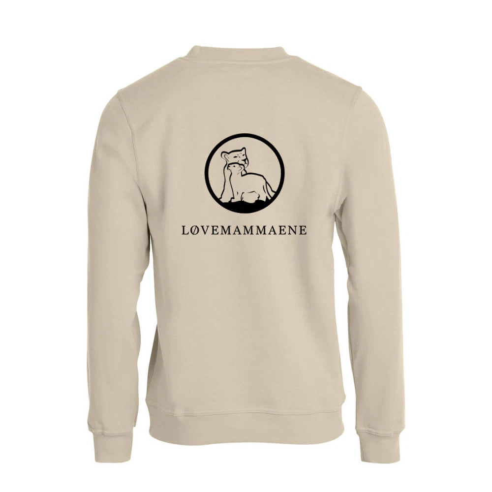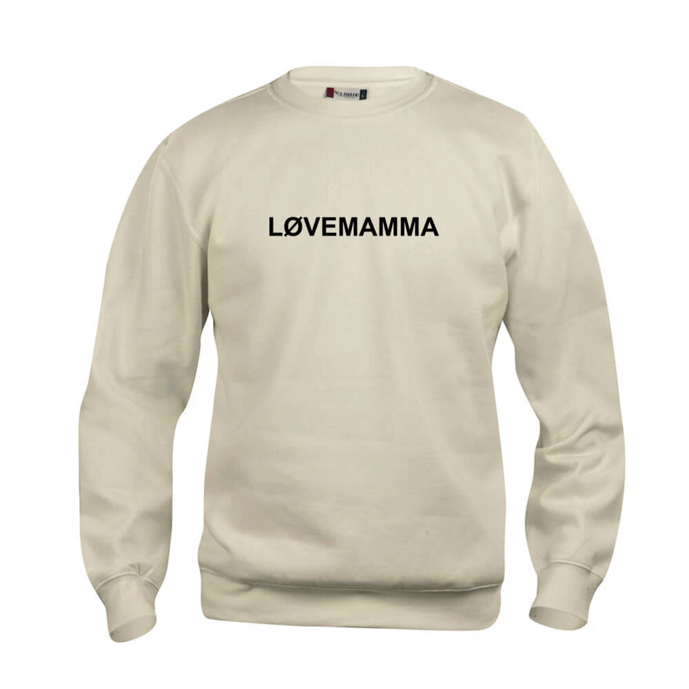 Rundhalset lys beige genser med teksten «LØVEMAMMA» på brystet.