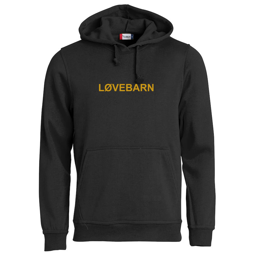Digg hettegenser i svart med teksten «LØVEBARN» på brystet og Løvemammaene-logo på ryggen. Myk og god med børstet innside.