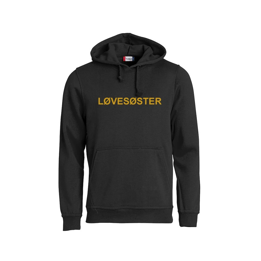 Digg hettegenser i svart farge med teksten «LØVESØSTER» på brystet, og Løvemammaene-logo på ryggen. Myk og god med børstet innside.