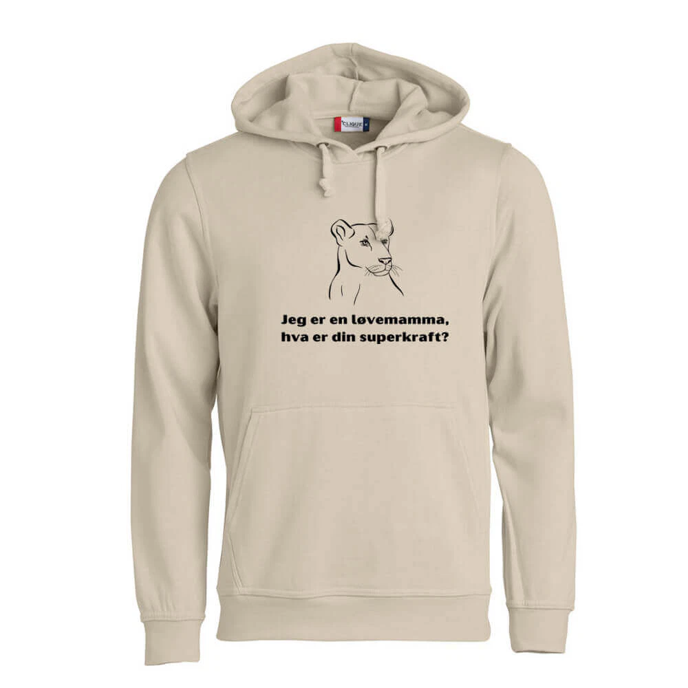 Digg hettegenser i lys beige farge med teksten «Jeg er en løvemamma, hva er din superkraft?» på brystet.