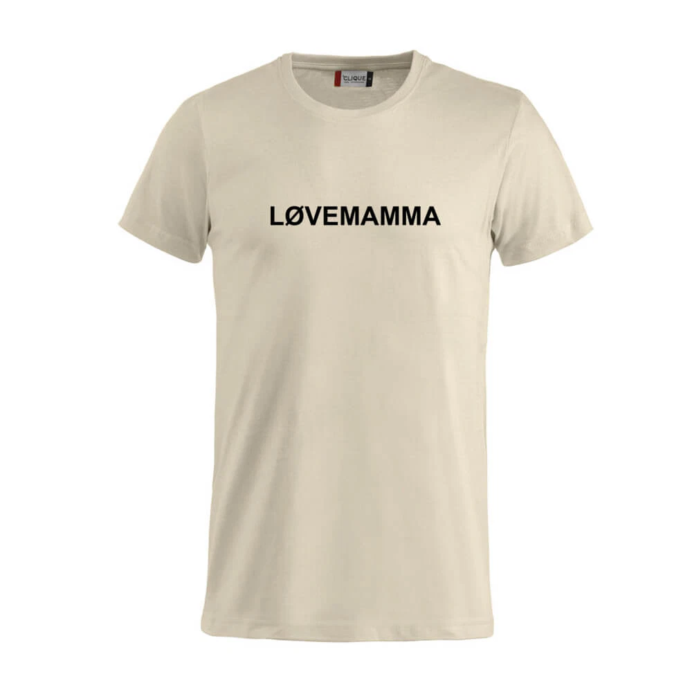Basic t-skjorte i nydelig beige farge med teksten «LØVEMAMMA» på brystet.