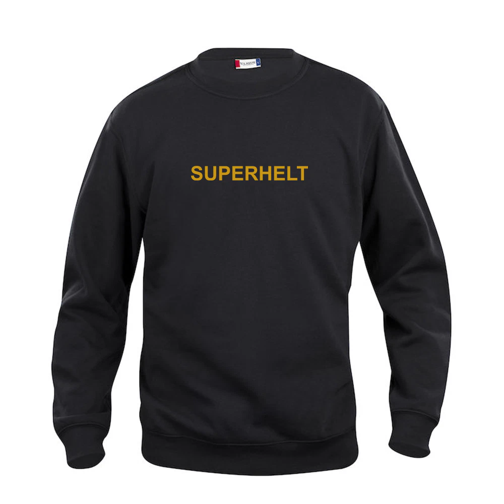 Rundhalset svart genser med teksten «SUPERHELT» på brystet. Løvemammaenes logo på ryggen.