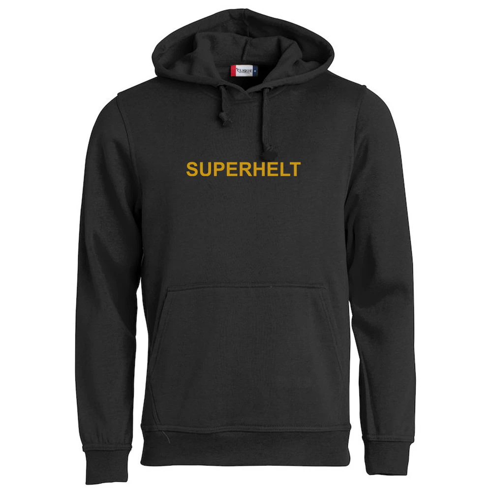 Digg hettegenser i svart med teksten «SUPERHELT» på brystet og Løvemammaene-logo på ryggen. Myk og god med børstet innside.