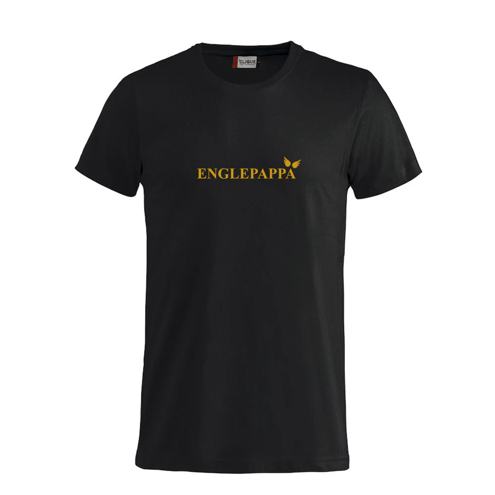 Basic t-skjorte i svart farge med teksten «ENGLEPAPPA» på brystet, med små tilhørende englevinger.