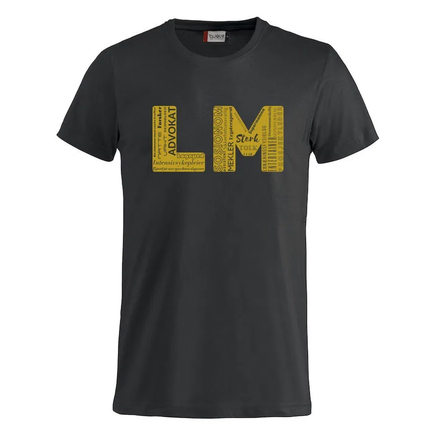 Basic t-skjorte i svart farge med printet «LM» på brystet. Printet består igjen av flere ord relatert til å være løveforelder.
