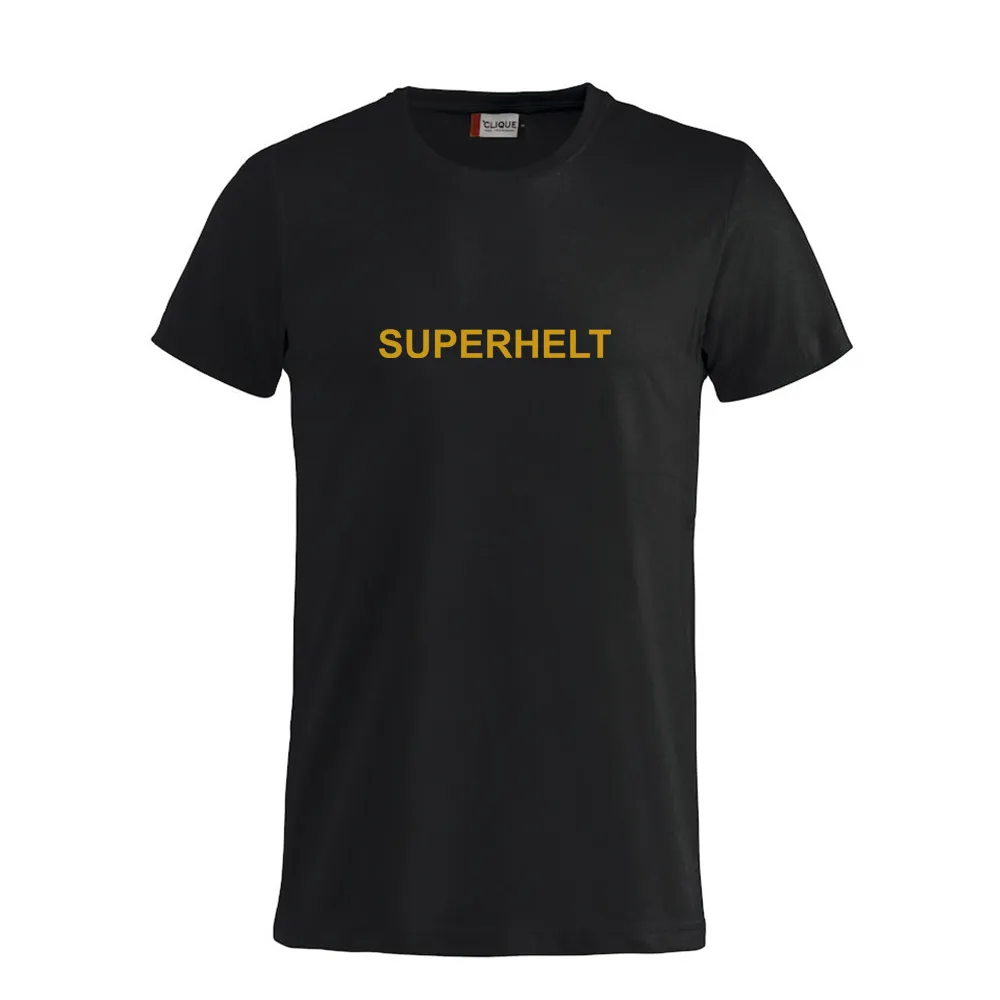Basic t-skjorte i svart farge med teksten «SUPERHELT» på brystet.