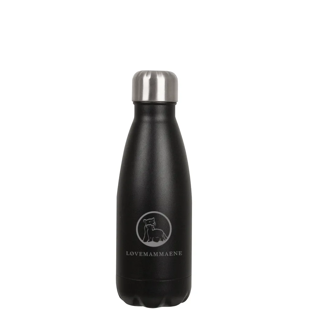 Lekker drikkeflaske i rustfritt stål med svart matt overflate og Løvemammaenes logo.