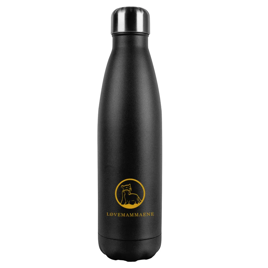 Lekker drikkeflaske i rustfritt stål med svart matt overflate og teksten «LØVEPAPPA».