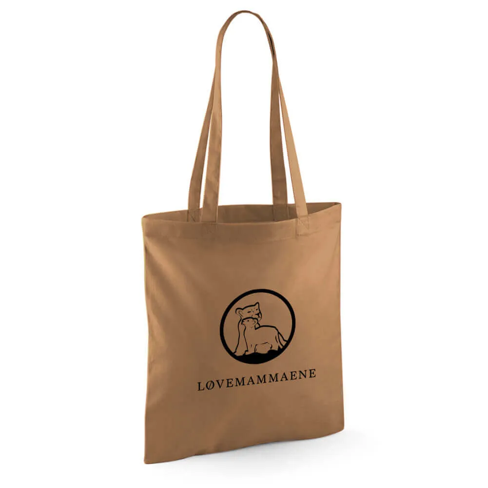 Handlenett i fargen caramel med lang hank trykket med Løvemammaenes logo i svart.