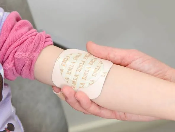 Emla-Patch: Ein Anästhesiepflaster, das rechtzeitig vor Eingriffen mit Injektionen auf die Haut geklebt werden kann. Das Pflaster sollte 1 Stunde vor der Blutentnahme eingenommen und 10–15 Minuten entfernt werden. vor der Blutentnahme. Es kann schwierig sein, die Blutgefäße zu sehen/zu finden, wenn sie kurz zuvor entfernt werden. Emla ist auch in Form einer Creme in einer Tube erhältlich, die aufgetragen und mit einem festen Pflaster darüber aufgetragen werden kann.