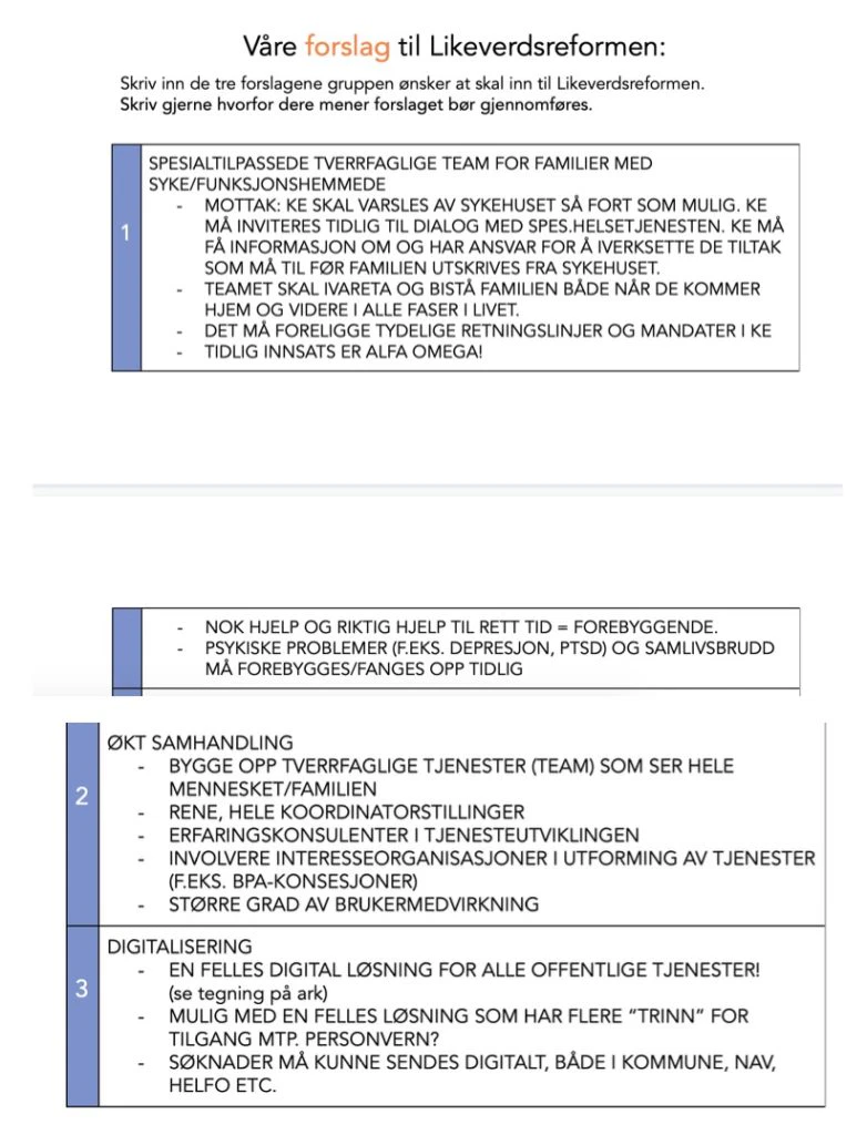Dette var problemstillinger og tema vi jobbet om i grupper. Vi avsluttet dagen med å komme med forslag og idéer til hva som må til og hvordan dette skal løses, blant annet at det må på plass spesialtilpassede tverrfaglige team for familier med syke/funksjonshemmede barn. Det var 6 svært nyttige timer, og vi håper samtlige dialogmøter med noen av våre innspill vil gjenspeile seg i Likeverdsreformen som regjeringen skal legge fram.Løvemammaene vil ellers rose regjeringen for denne direkte involveringen i utformingen av Likeverdsreformen. Vi har stor tro på at slik brukermedvirkning vil være med på skape bedre tjenester til våre medlemmer