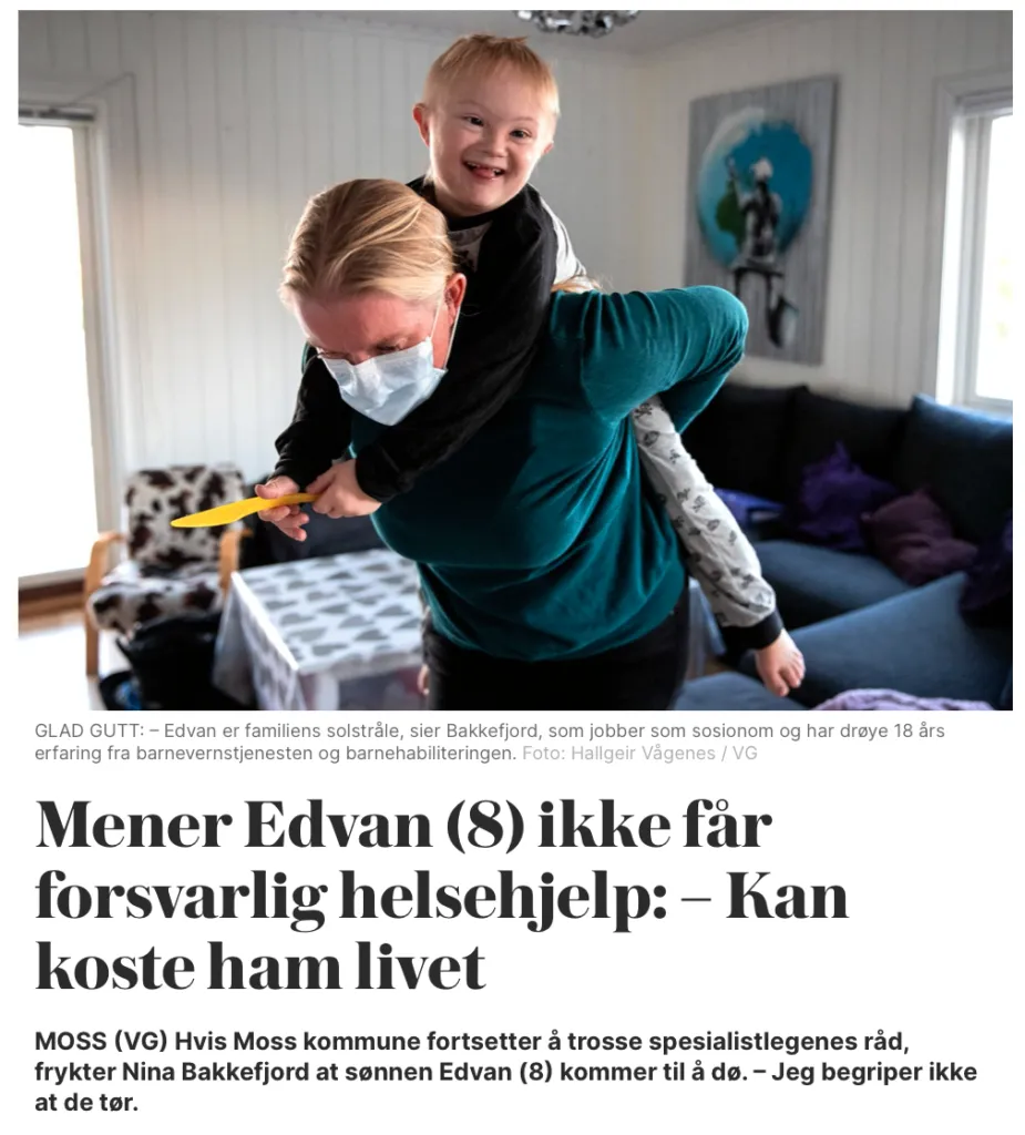 Kommunene kan veldig ofte ikke levere forsvarlige nok helsetjenester til de alvorligst syke barna og utsetter dem dermed for livsfare! Når pleiepengekvoten tar slutt er det nettopp her regjeringen mener vi skal overlate barna våre. I denne saken er det urovekkende at hverken kommunen eller Fylkesmannen setter en stopper for den livsfarlige praksisen de driver overfor Nina Bakkefjords lille Edvan! At kommunen ikke anser feil de gjør – feil som kunne tatt livet av Edvan på få minutter – som soleklare avvik er helt hinsides all fornuft, og viser bare at det er fullstendig mangel på faglig innsikt i Moss kommune. Det skal og kan ikke være mulig å overprøve spesialisthelsetjenestens anbefalinger!