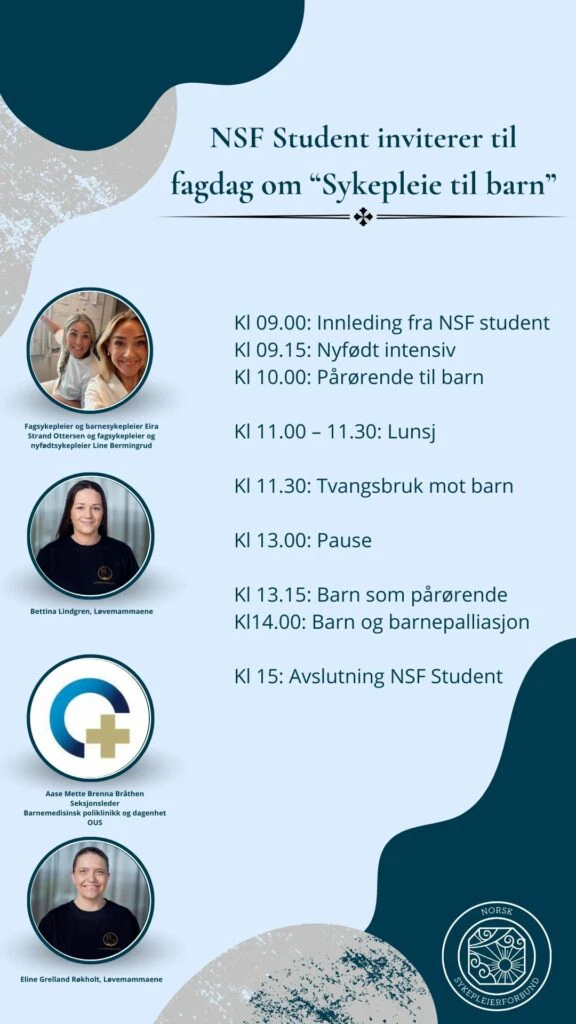 NSF Student og Løvemammaene har gjennom godt samarbeid og dialog med utdanningsinstitusjoner i Oslo-området, planlagt og utviklet en egen fagdag om barn for sykepleiestudenter. Dette har vi sett veldig frem til å gjennomføre!