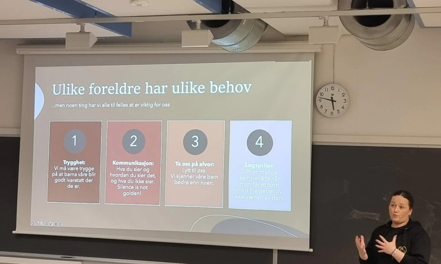Hun snakket om hvordan familiene vil bli møtt av hjelpeapparatet, hva som er viktig for oss når vi leverer barna fra oss, f.eks. i barnehagen eller på avlastningsbolig, og hva kan nettopp studentene kan bidra med når de kommer ut i arbeidslivet, for å utgjøre en positiv forskjell i en krevende hverdag. Det ble også formidlet personlige erfaringer fra annerledeslivet og årevis som avhengig av det offentliges hjelp og støtte.