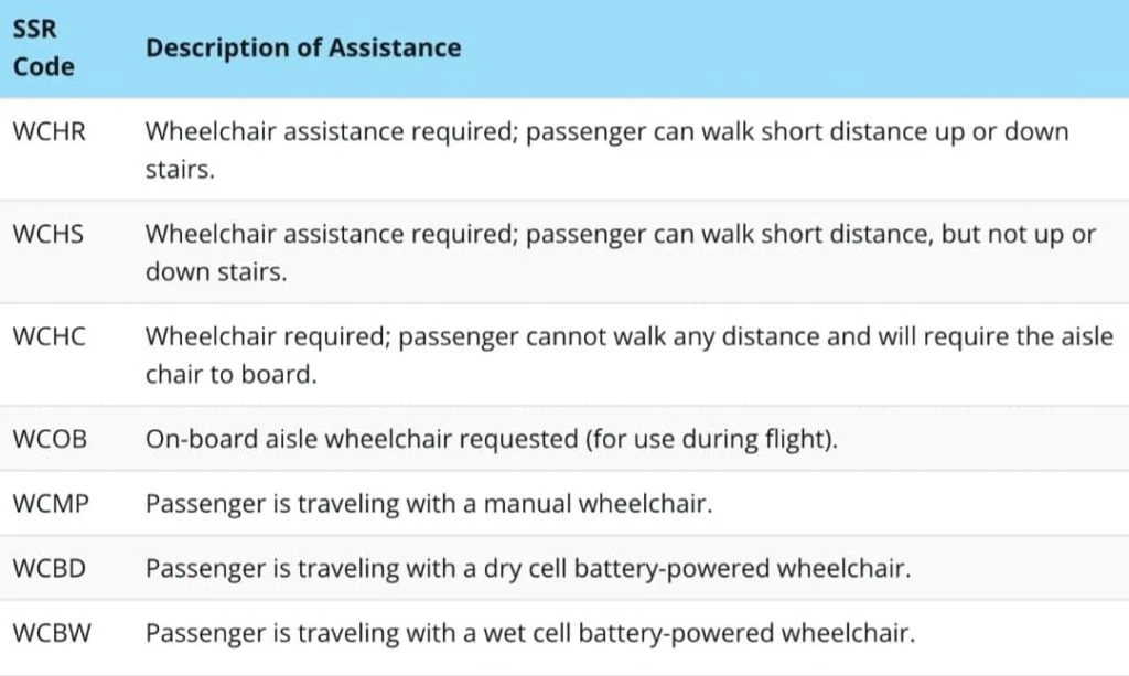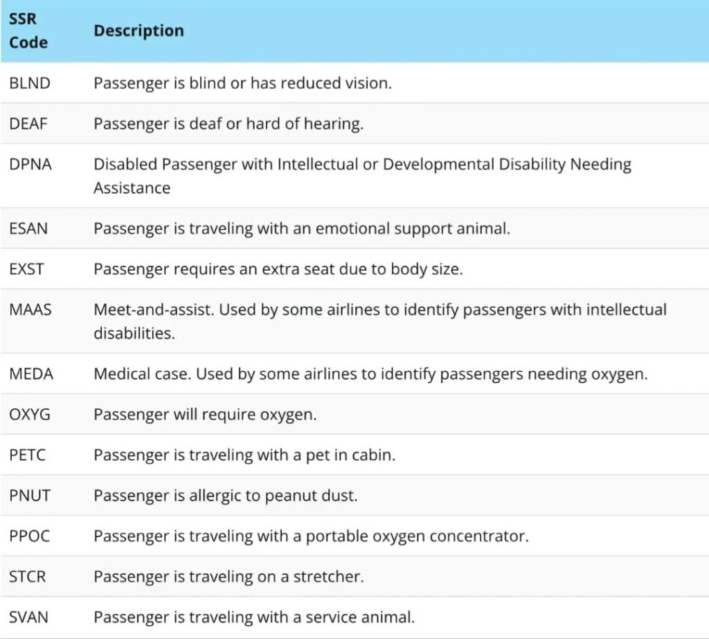 Følgende SSR-koder gjelder spesifikt assistanse som tilbys passasjerer med redusert mobilitet. Disse kodene brukes av de fleste flyselskaper, men noen utenlandske flyselskaper kan bruke et annet format.