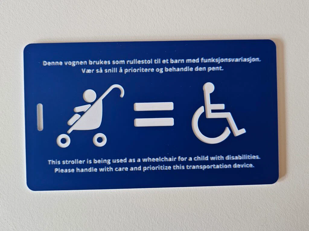 Lei av at vognen til barnet ditt som brukes som rullestol blir håndtert for røft? F.eks. på reise når den sendes som bagasje på fly. Eller at folk ikke forstår hvorfor du bruker HC-plassen på bussen? Et skilt som dette kan være nyttig å ha festet på vognen.