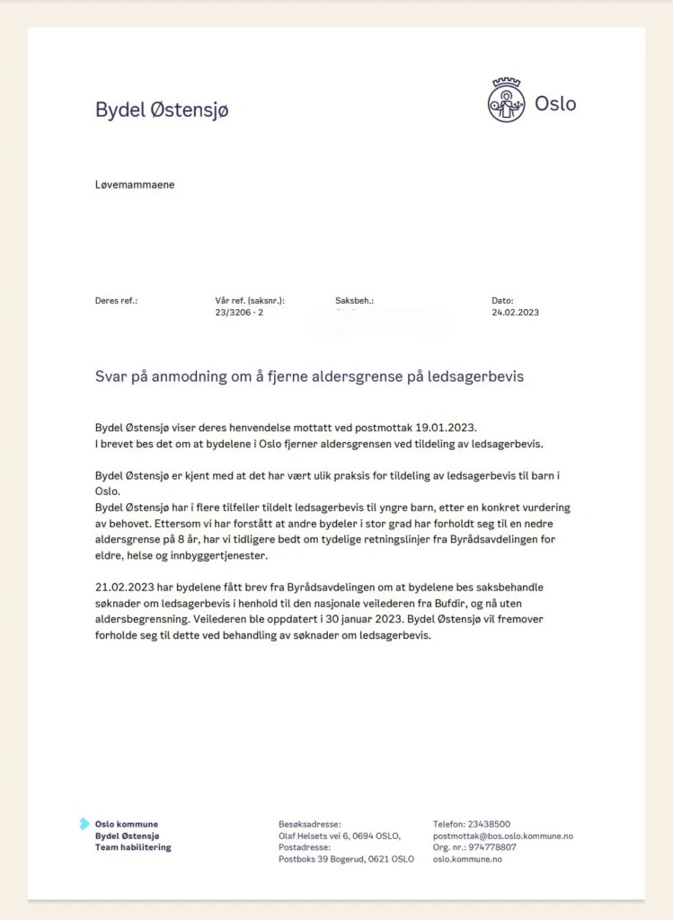 Løvemammaene region Sør-Øst har tidligere sendt anmodning til både den enkelte bydel i Oslo, samt til Byrådet i Oslo kommune og anmodet dem om å fjerne aldersgrensen på ledsagerbevis. I januar 2023 purret vi på bydelene, og ba om en redegjørelse for praksis.