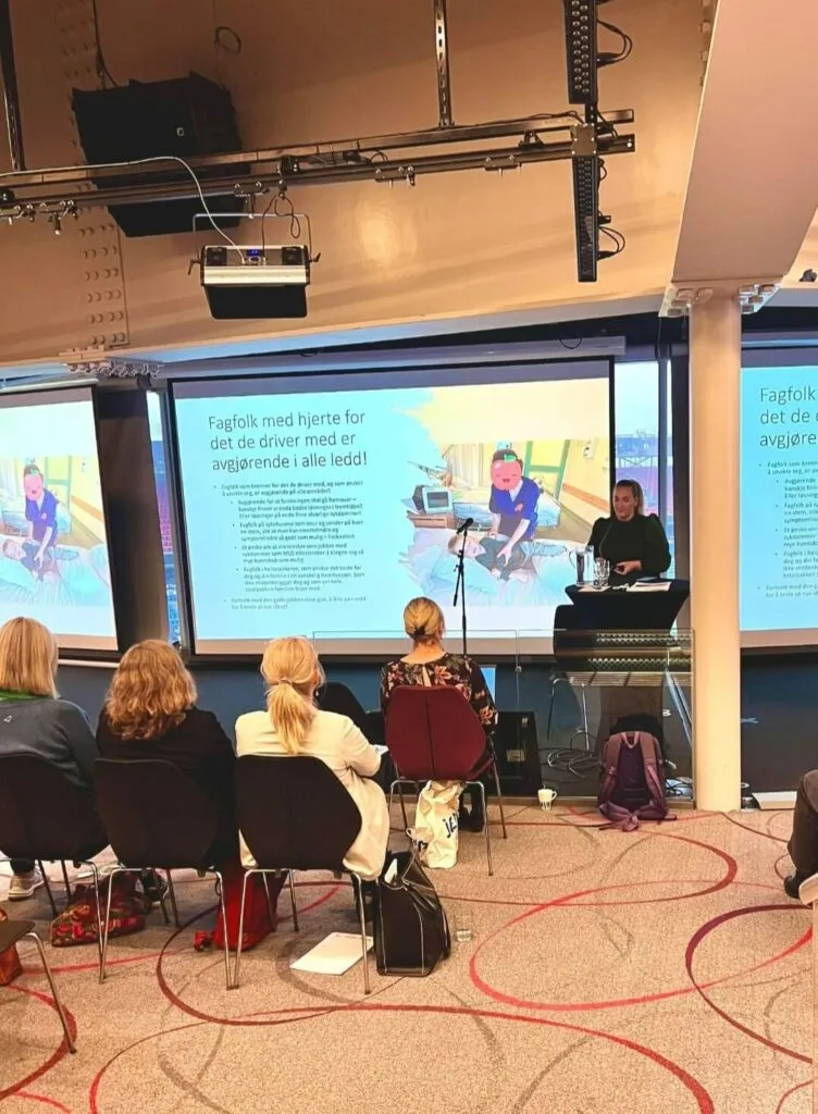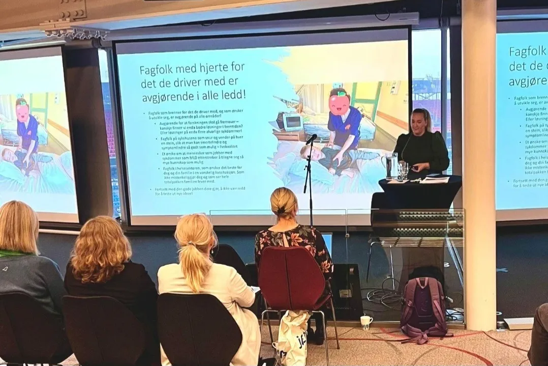 Beate bidro til fagdagen ved å holde et innlegg om dagliglivets utfordringer for familier som lever med MLD, samt de ulike utfordringene hun har møtt på i arbeidet med å få denne behandlingen tilgjengelig i Norge. Beate snakket blant annet om at systemet rundt Beslutningsforum, Nye Metoder og unntaksordningen trenger store forbedringer for å treffe flere pasienter på sjelden-feltet. Innlegget ble godt mottatt blant forskere og klinikere i salen.