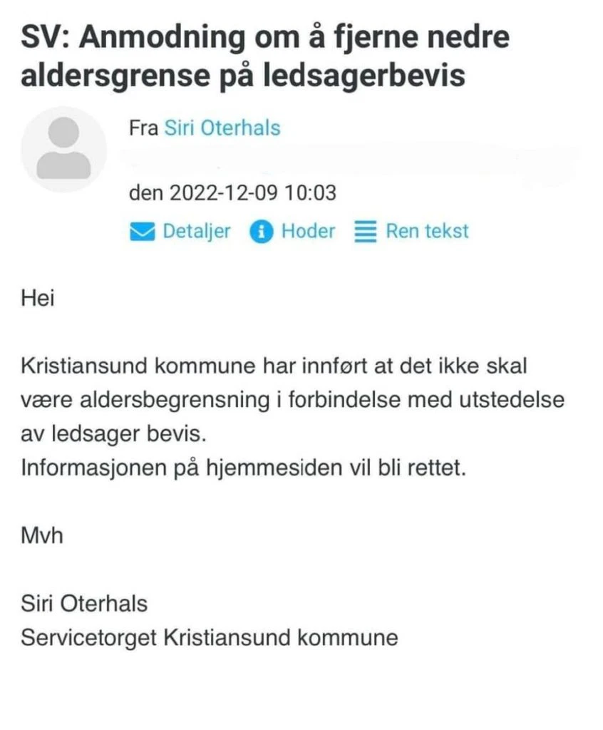 Etter at regionslaget vårt Løvemammaene Midt sendte anmodning til alle kommunene i regionen de dekker om å fjerne den nedre aldersgrensen på ledsagerbevis, har nok en kommune besluttet at det ikke skal være aldersgrense i deres kommune – nemlig Kristiansund! Hurra!