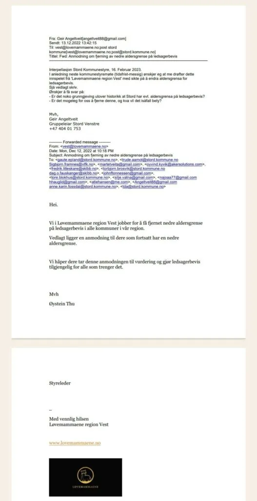 Herêma Løvemammaene Rojava îro weşana zindî ya şaredariya Stord ji meclîsa şaredariyê şopand, ku nûnerê Geir Angeltveit ji Stord Liberal di derheqê rakirina sînorê temenî de ji bo sertîfîkayên hevalbendê navbeynkarek kir, piştî ku Løvemammaene daxwaznameyek berî Sersalê şand.