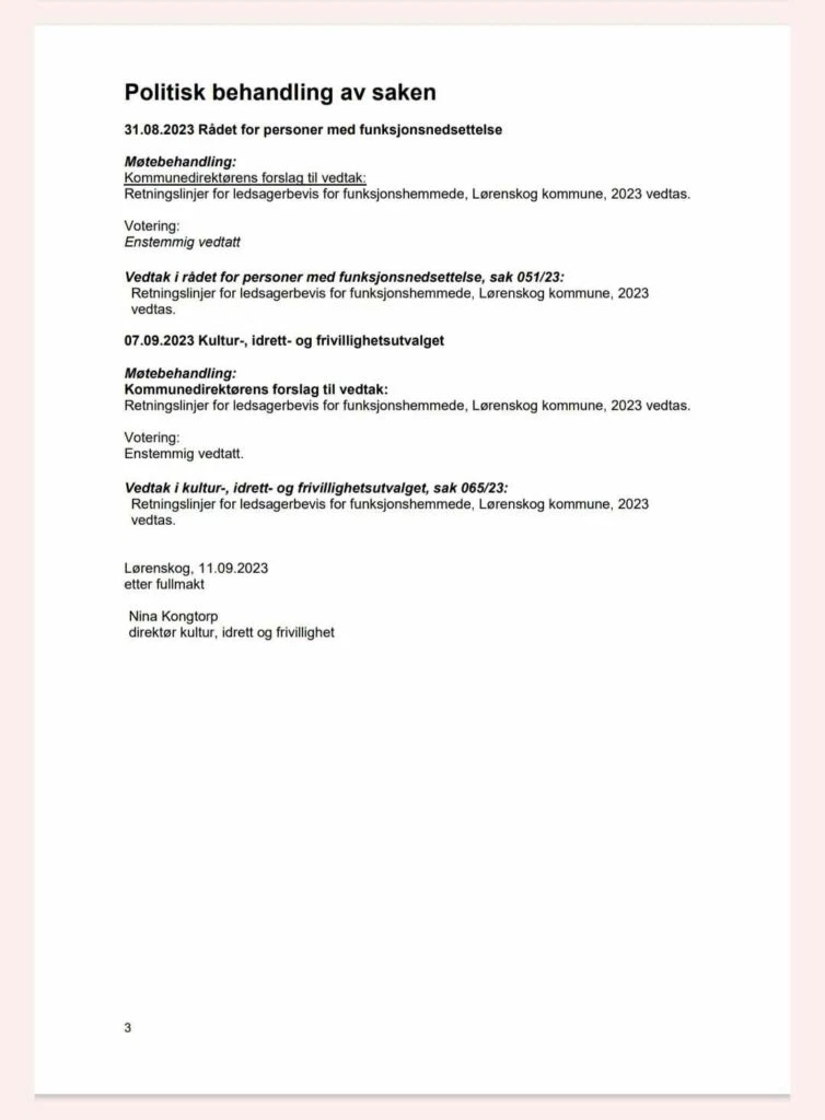 Nedenfor kan dere lese saksfremlegget og vedtaket, samt de nye retningslinjene i Lørenskog kommune.