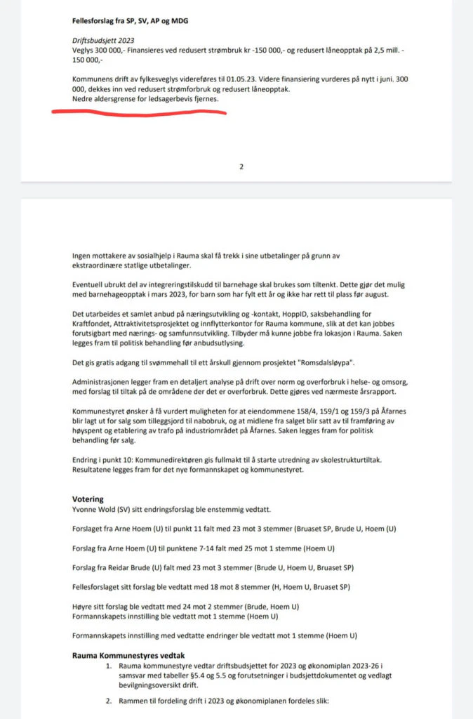 I kommunestyremøtet i Rauma kommune den 15.12.2022 ble det fremmet et fellesforslag fra SP, SV, AP og MDG om å fjerne aldersgrensen. Også Høyre hadde dette som forslag. Til slutt ble fellesforslaget enstemmig vedtatt.