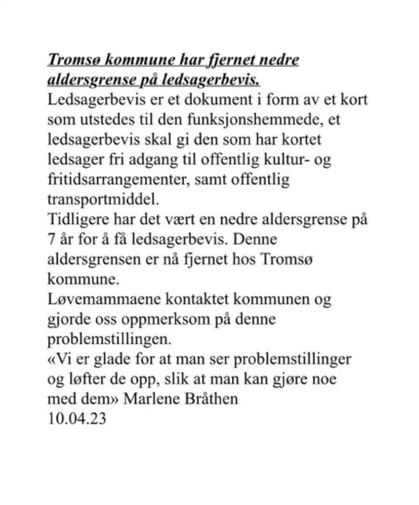 Jippi – nok en kommune i Nord-Norge har fjernet aldersgrensen for ledsagerbevis takket være regionslaget vårt Løvemammaene region Nord! Denne gang er det Tromsø kommune som tar bort aldersgrensen.